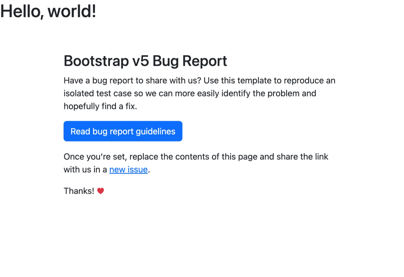 <p>Once you're set, replace the contents of this page and share the link with us in a <a href="https://github.com/twbs/bootstrap/issues/new/choose" rel="noopener noreferrer" target="_blank">new issue</a>.</p>