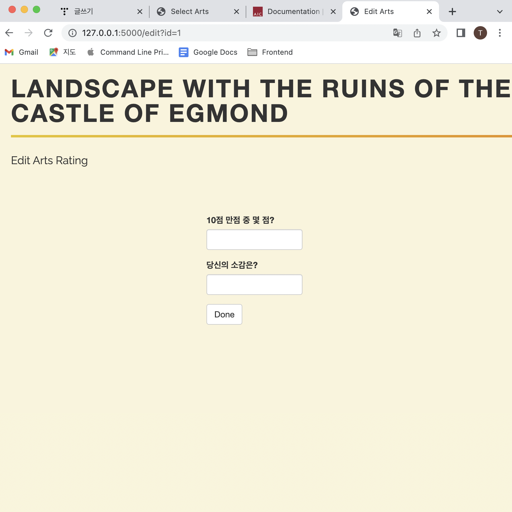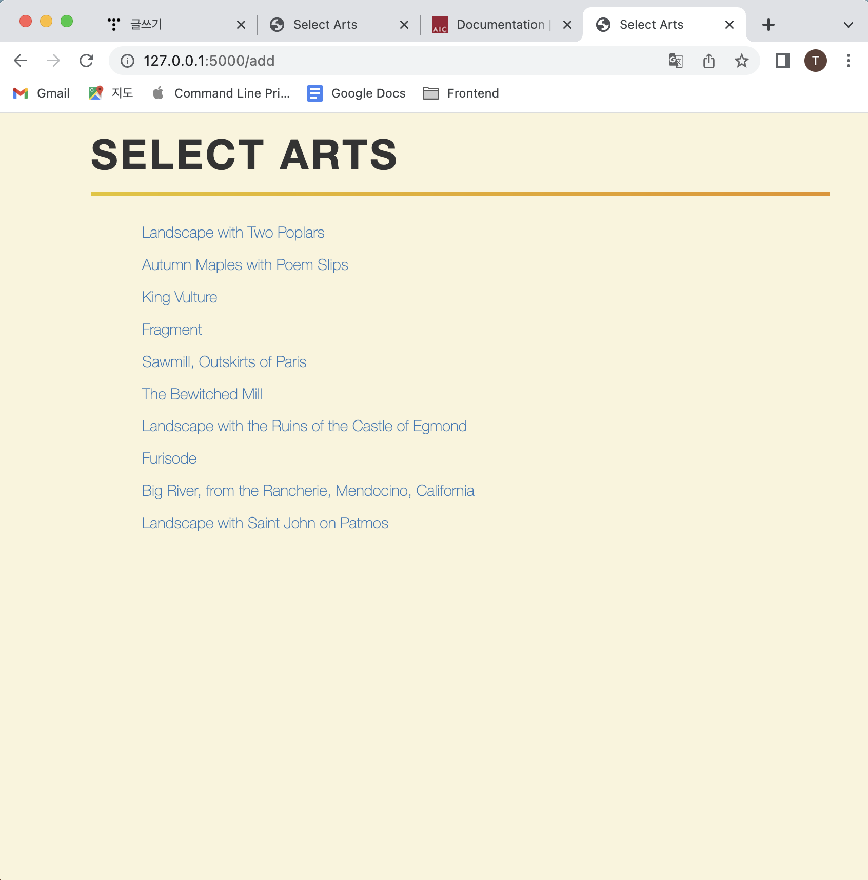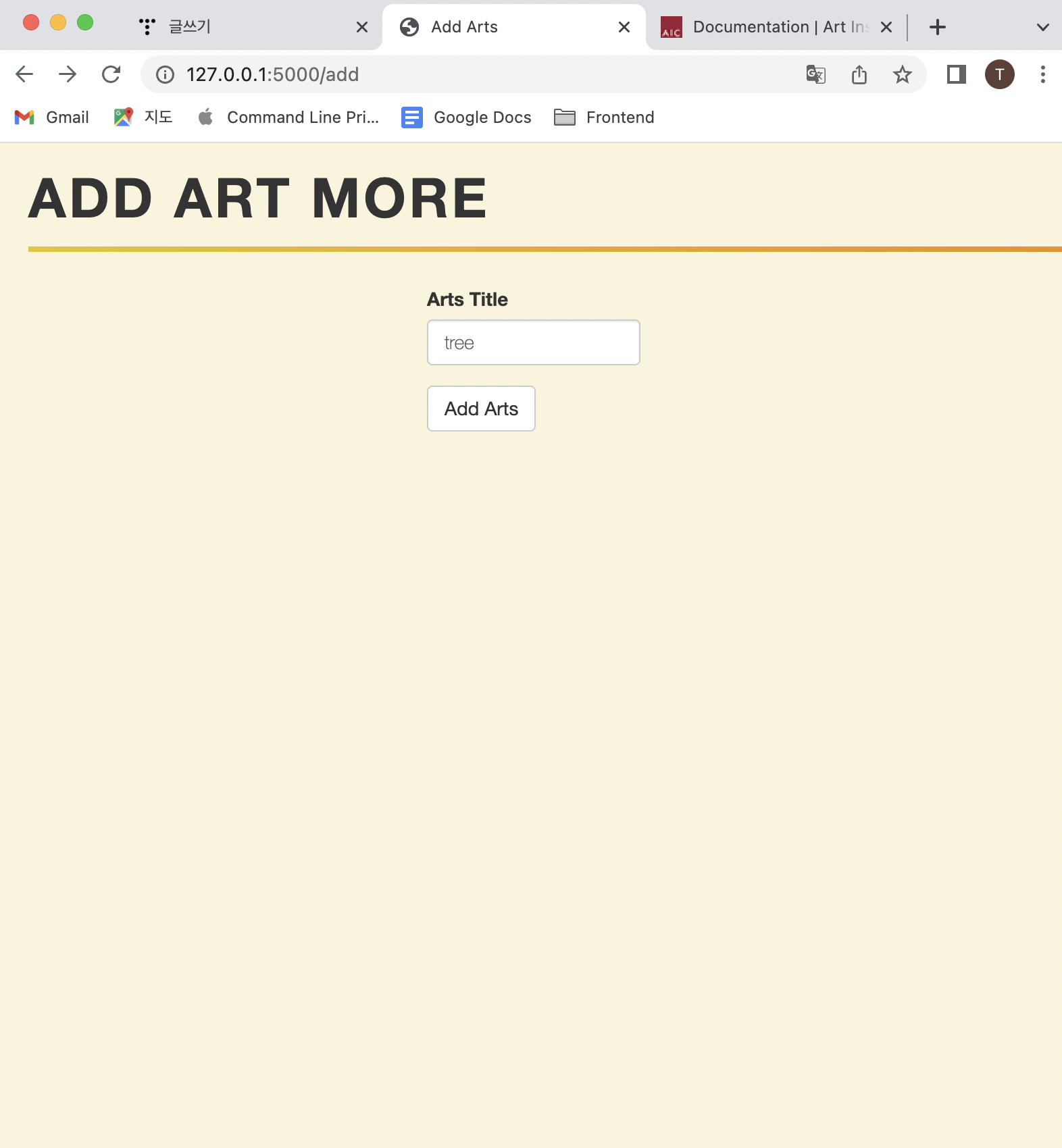 - FlaskForm 을 이용해서 문자로 입력받을 'title'과 제출버튼으로 입력받을 'submit'을 만드는 함수 FindArtsForm(FlaskForm)을 만들고 그걸 'form' 객체에 할당했다.