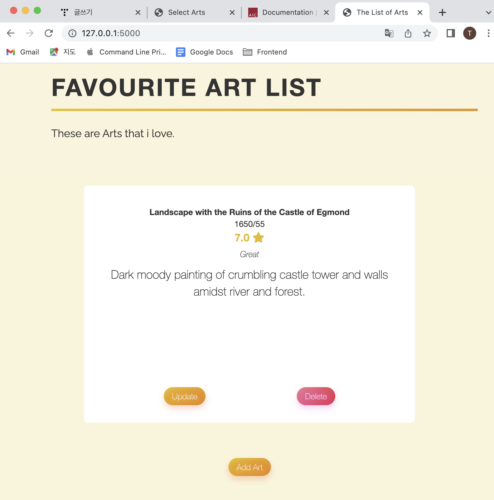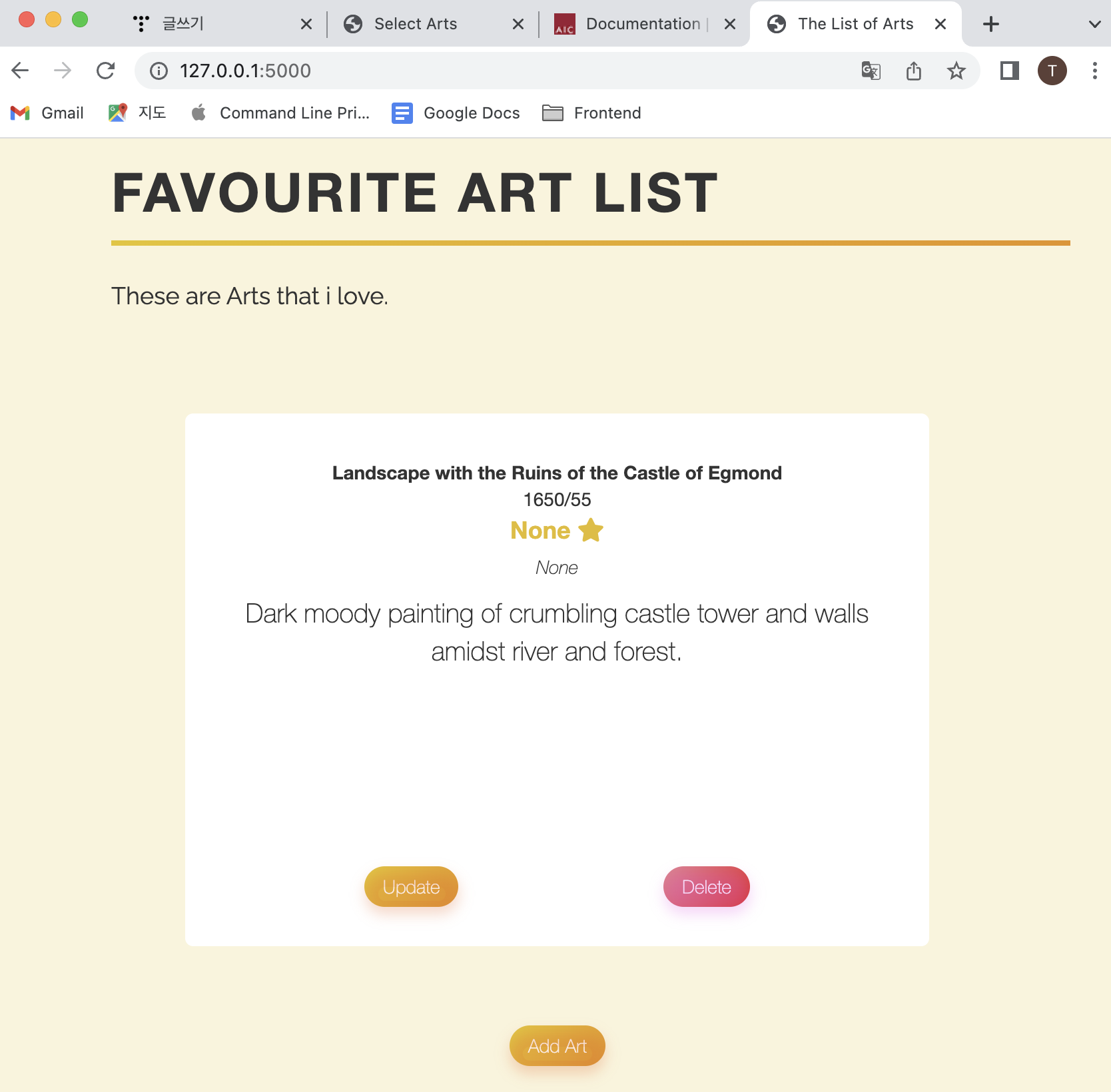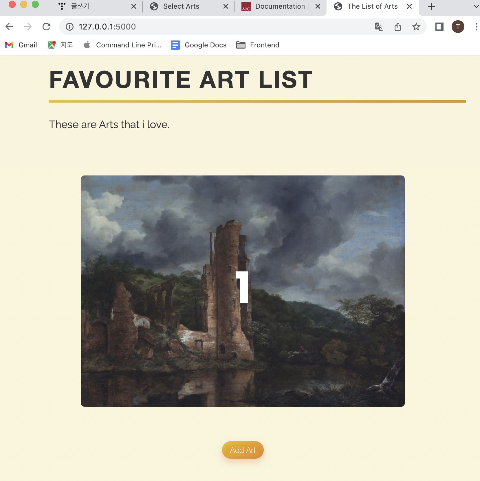 index.html 안에 있는 "add" button을 누르고 자료를 검색할 키워드를 form 양식으로 받아서 api에서 나의 DB에 있는 Arts4.db에 있는 '열' 항목들의 값을 찾아서 저장하고 다시 그 데이터를 메인페이지에 나타낸다.